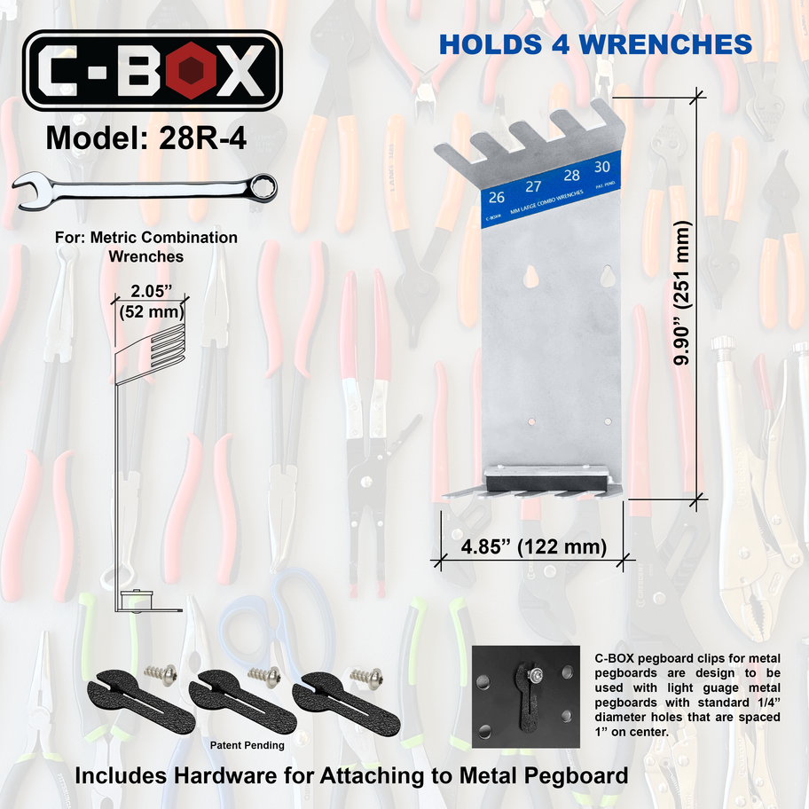 C-BOX Metric Combination Wrench Holder - (26mm to 30mm) Holds 4 Wrenches, 14GA Stainless Steel, Wall & Pegboard Mountable, Space Saving Organizer for Shops & Garages.