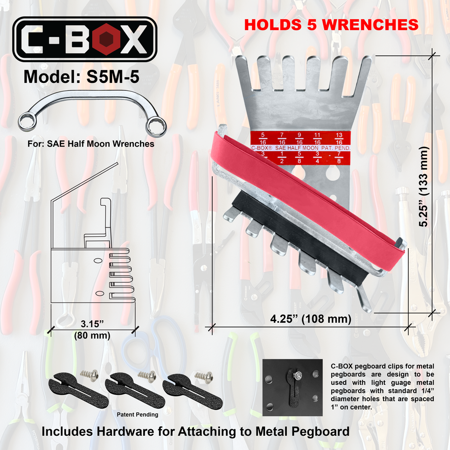 C-BOX SAE Half Moon Wrench Holder with Rubber Band - (5/16:3/8 in. to 7/8:13/16 in.) Holds 5 Wrenches, 14GA Stainless Steel, Wall Mount Mobile-Ready Organizer for Service Trucks & Garages.
